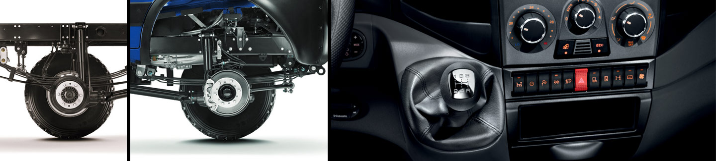 New Daily 4x4 suspension is particularly suited to off-road use. The parabolic longitudinal leaf springs are highly flexible and have ample range. The axles, mounted on leaf springs, guarantee stability and traction in difficult off-road conditions. The telescopic shock absorbers and the anti-roll stabiliser bars, together with the live axle, allow for excellent performance on any type of terrain and slope without penalising load capacity.